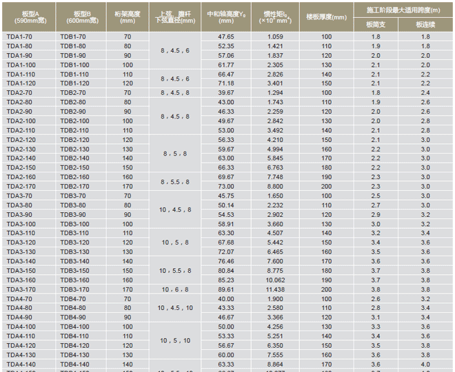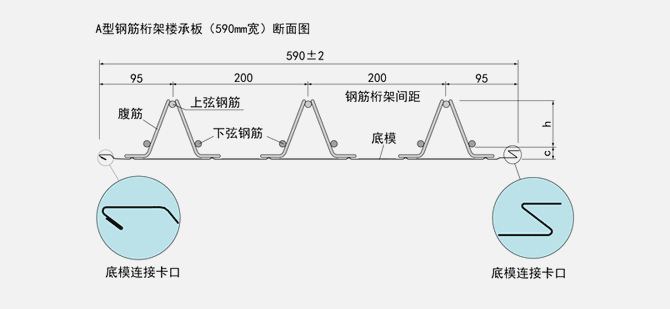 A型和B型是目前主推的.鋼筋桁架樓承板產(chǎn)品兩大類型,A型產(chǎn)品寬度為590mm,B型產(chǎn)品寬度為600mm,兩大類型產(chǎn)品的具體型號、尺寸和截面系數(shù)等參數(shù),請?jiān)斠娤卤怼?/span>